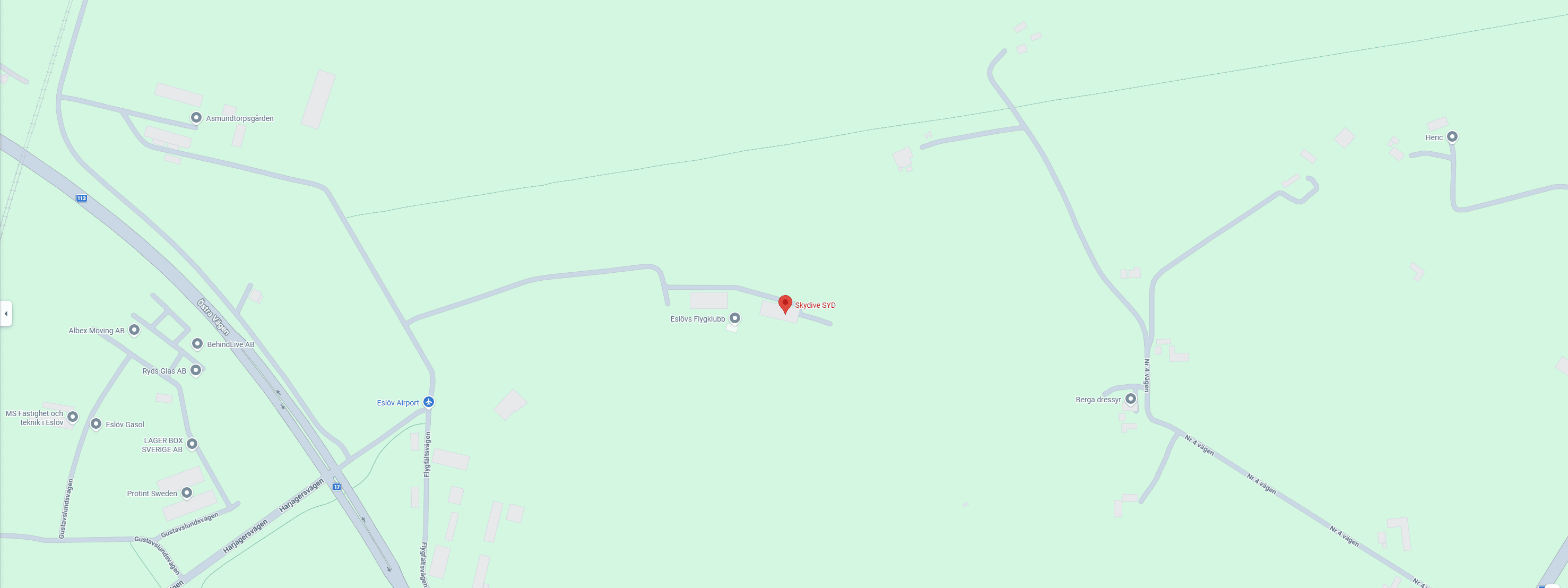 Skydive Syd ligger på Eslövs flygfält, strategiskt placerat mitt i Skåne. Oavsett om du kommer från Malmö, Lund, Helsingborg eller Kristianstad är det enkelt att ta sig hit.